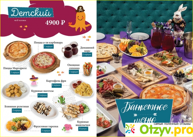Меню в ресторане достаточно разнообразное и вкусное. Есть отдельно меню для деток. К примеру блинчики с нутеллой, картофель фри, нагетсы, куриный шашлык, фруктовые салатики, молочные коктейли и даже пюре с котлетой, макароны с сосисками и куриный супчик. Вообще абсолютно на любой вкус и возраст ребенка. Но как правило многие заказывают пиццы. Мне нравятся как готовят пиццы, очень вкусные, на тонком тесте. И детям и взрослым нравятся. Также есть специальное банкетное меню. Там различные предложения и цены.