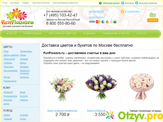 Букеты в интернет-магазине Funflowers.ru можно подобрать не только по названиям цветов, но и по цене, кому вы собираетесь их подарить и по какому поводу.