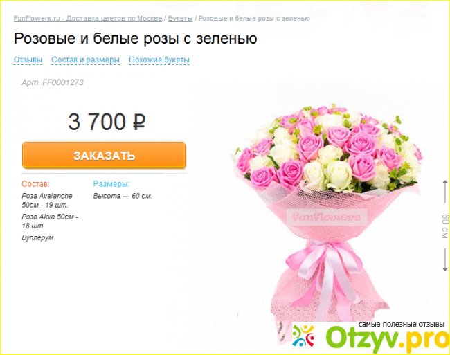 Выбрала я в подарок букет цветов розовые и белые розы с зеленью. Стоимость этого букетика составила 3700 тысяч рублей. На сайте размещена информация о букете- его размер, состав, способ доставки, оплаты, время доставки, телефон с обратной связью.