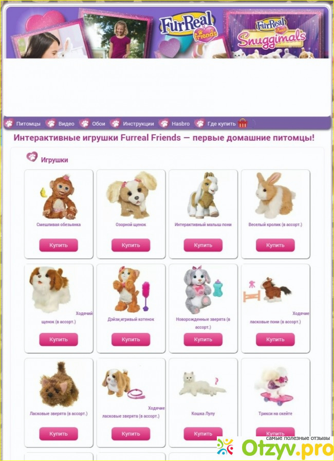 У производителя под названием Furreal friends есть следующие игрушки для детей: смешливая обезьяна, озорной щенок, интерактивный малыш пони, весёлый кролик, ходячий щенок, игривый котёнок, новорожденные зверята, ходячие ласковые пони, ласковые зверята, кошка лулу, трикси на скейте и так далее.