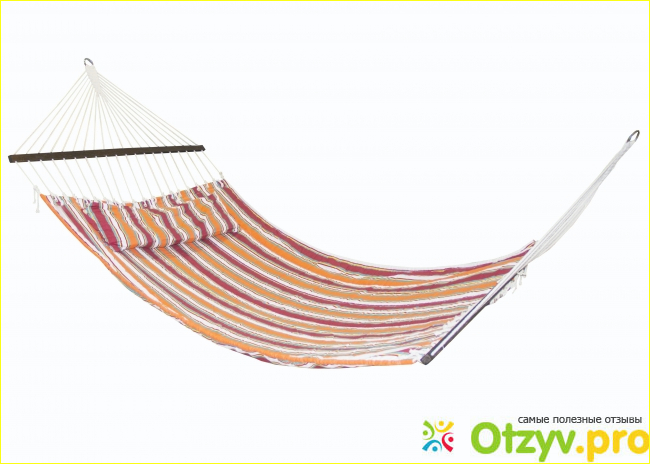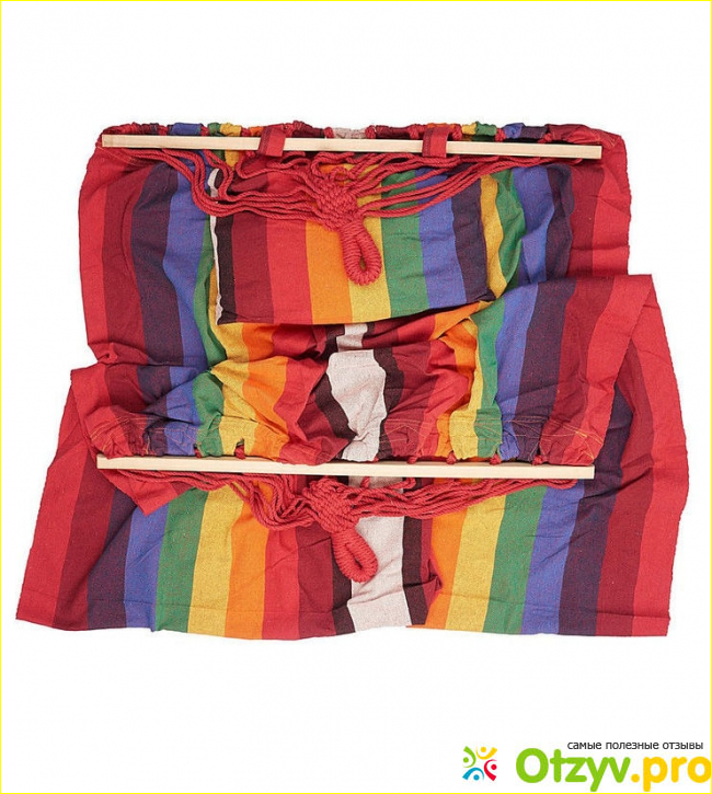 Порадовало наличие деревянных планок. Конечно, без планок гамак стоит намного дешевле, но с планкой несравненно удобнее: она удерживает гамак в развёрнутом положении и не позволяет ткани закручиваться. Деревянная планка делает это приспособление более стабильным, так легче садится и легче вставать.
