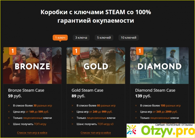 Всем привет! Ребят хотел бы действительно посоветовать данный сайт тем кто хочет приобрести себе по отличным ценам игры. Порадовал контент на сайте есть оптово-розничный магазин топовых ключей Steam в котором есть разные пакеты на 1,3,5 и 10 ключей а именно Бронза, Золото и Бриллиантовый кейс. Приобрел себе Бриллиантовый на 5 ключей и не пожалел, количество топовых игр которые выпали с этого кейса меня шокировали причем за такую мизерную цену.