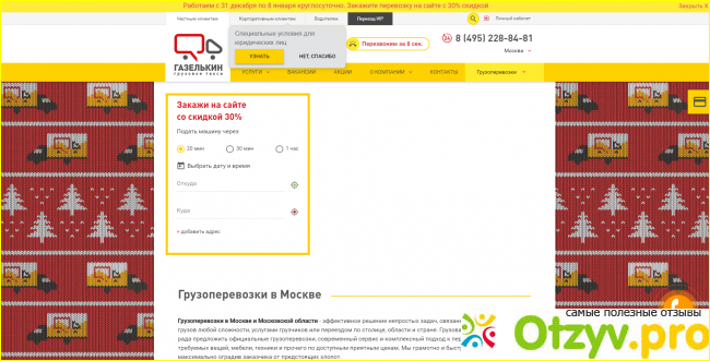 На главной странице официального сайта, самой верхней его строкой на желтом фоне, выделяется надпись о том, что все праздничные дни данная компания работает без перерывов, выходных и так далее и двадцать четыре часа в сутки, тогда как большинство предприятий отдыхает. Да еще фирма обещает в эти дни своим клиентам скидки до тридцати процентов.
