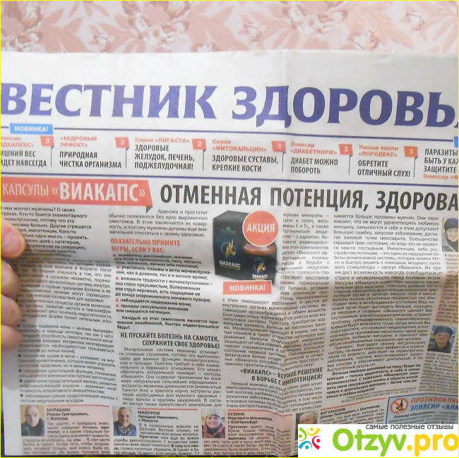 Из номера в номер, которые попадают в мой почтовый ящик с разной периодичностью, на страницах "Вестника здоровья" печатаются статьи о чудодейственных возможностях некоторых биодобавок. Для большей веры обязательно даны положительные отзывы о каждом средстве тех, кто на себе почувствовал целительную силу БАДов, причем это не какие-то обезличенные отзывы. Везде указано полное ФИО, место проживания и даже напечатана фотография человека, высказавшегося по поводу использования биодобавки от "Фитомакс".