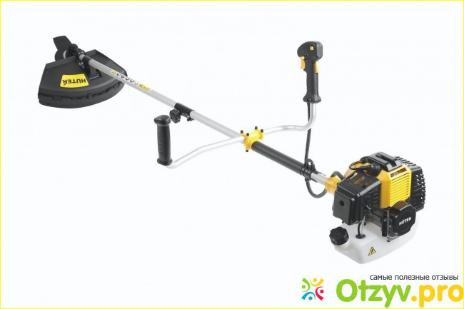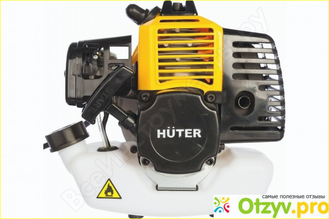 Первым делом хочу отметить классный внешний вид триммера. Второй момент - это максимальное удобство пользования. Двигатель у него расположен наверху, собственно он работает на бензине, объемом 0,7 литров. Мощный мотор - 7500 оборотов в минуту, 1,3 лошадинные силы. Что касается шума, то для подобной техники - не столь высокий - 96 дБ. Триммер Huter GGT-1000 S позволяет скашивать 26 сантиметр в ширину, что считается довольно неплохим показателем.