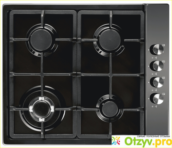 Классическая газовая чёрная модель. Установленные сверху решетки не скользкие, кастрюли на них стоят равномерно, устойчиво. Регулируется подача газа плавно, благодаря поворотным ручкам, которые расположены на лицевой панели, слегка скошенной.