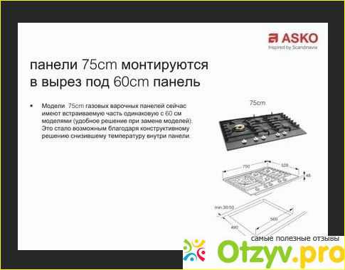 Начнем, пожалуй, с габаритов, так как они не совсем стандартные, и для многих людей это будет важной информацией. Итак, габариты Газовой варочной поверхности Asko HG1776SB следующие: сорок восемь миллиметров на семьсот пятьдесят миллиметров на пятьсот двадцать шесть миллиметров. Так как Газовая варочная поверхность Asko HG1776SB является встраиваемой, то имейте ввиду, что ниша для встраивания должна быть следующего размера: пятьдесят шесть сантиметров на сорок девять сантиметров. Так что при установке варочной поверхности лучше доверить это дело профессионалу.