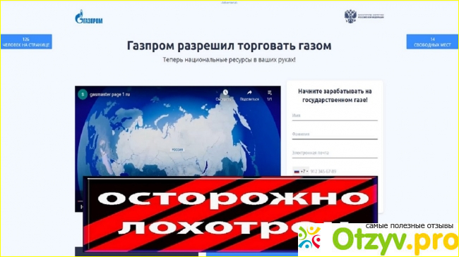 Далее, слева под этим видео пишут призывные лозунги типа: “Начните зарабатывать на государственном газе!” (или что-то этого. И предлагают заполнить анкету с вашими персональными данными: фамилия, имя, электронная почта, номер мобильного телефона. Под этим пунктами расположена кнопка призывов начинать уже действовать!