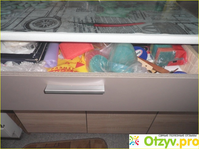 Рабочий стол также большой и глубокий, у меня кастрюли помещаются в него в три ряда, если их размер маленький. Есть также выдвижной ящик, а это вообще редкость, мало у каких производителей есть такие столы. В ящик помещается столько всего, что я никак не могу определиться, что буду там хранить, пока всё лежит как бы навалом, но для ложек и вилок место выделить нужно обязательно.