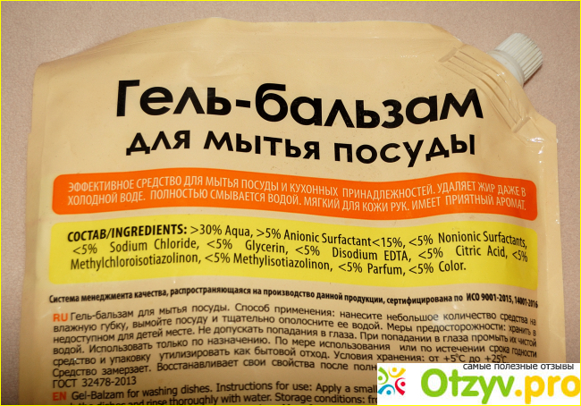 Как следует из надписи на упаковке, это не просто жидкость для мытья посуды, а гель-бальзам, поэтому на руки он должен действовать нежно.