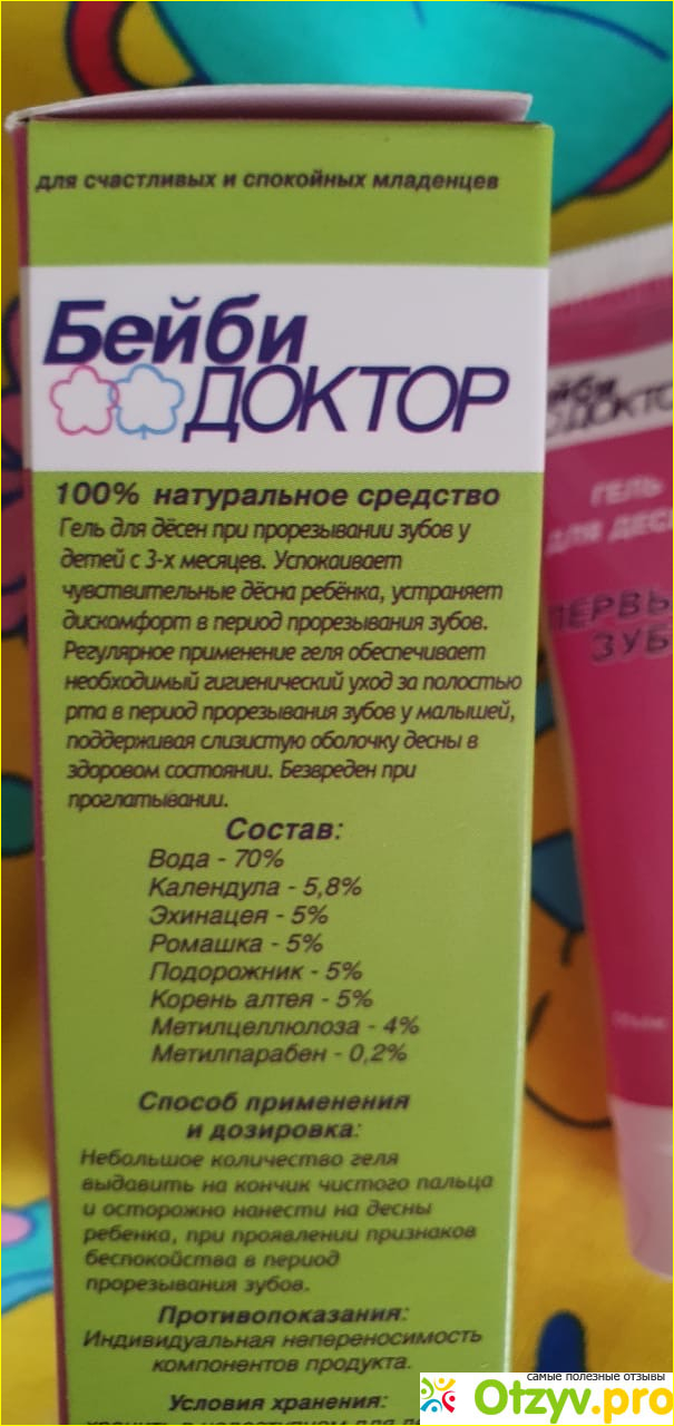 В составе геля для десен Бейби Доктор Первые зубки только натуральные компоненты, все они на основе трав, а именно: Вода, Календула, Эхинацея, Ромашка, Подорожник и Корень алтея, с вспомогательных веществ есть наличие Метилцеллюлоза - он оказывается пищевая добавка, а именно загуститель Е-461 (побочка — могут быть сбои в работе желудочно-кишечного тракта), а так же Метилпарабен - консервант Е-218, чаще всего может вызвать побочки в виде аллергических реакций, преимущественно на коже, но этих добавок минимальное количество, поэтому и можно сказать, что средство практически натуральное.