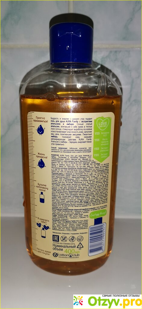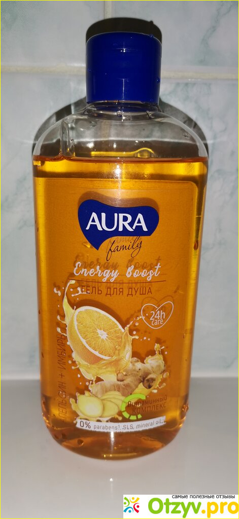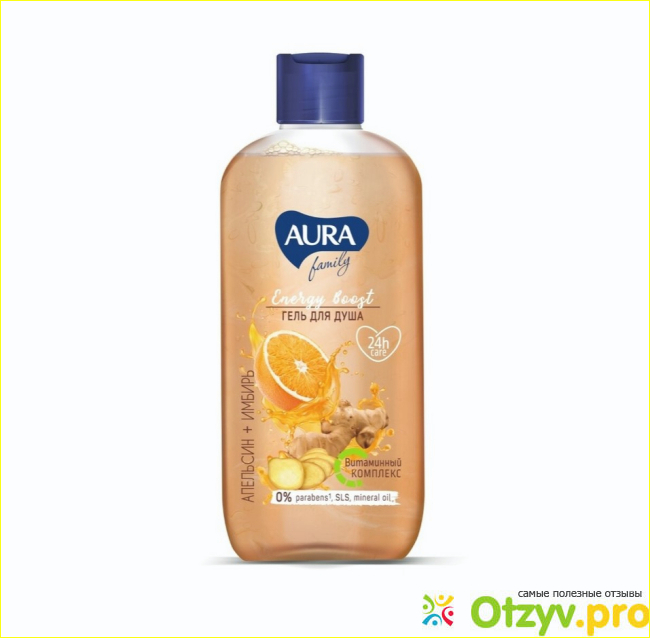 Гель Aura Family Апельсин и имбирь идет в большом объеме - это баночка 400 мл., при этом аромат средства цитрусовый и еще чувствуется имбирный пряник.