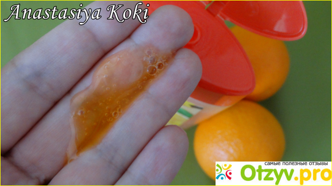 Консистенция данного геля вполне приятная. Она гелевая, не очень жидкая и имеет насыщенный оранжевый оттенок. По ощущениям скользкая.