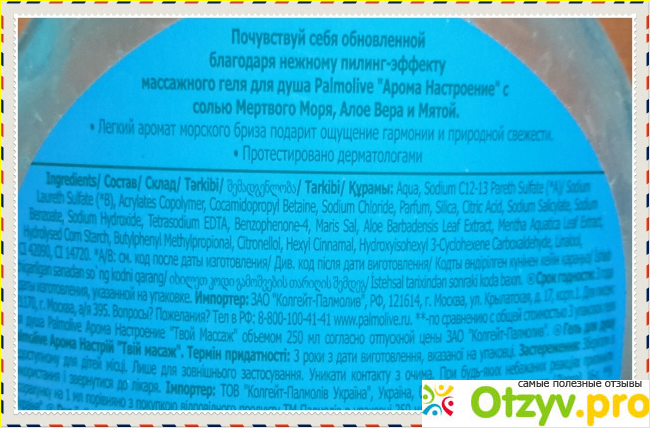Сам флакон изготовлен из прозрачного пластика, а цвет геля напоминает что то морское и очень приятное. Но это не простой гель, в него ещё добавлены микрочастицы морской соли Мёртвого моря, для очищения кожи вовремя приёма душа, то есть, получается своеобразный приятный пилинг-очищение.