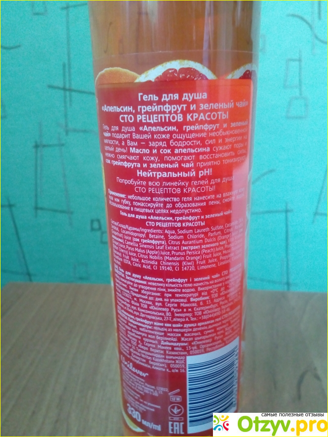 В сегодняшнем отзыве поделюсь впечатлениями от использования геля данной марки. Это тонизирующий гель с экстрактами апельсина, грейпфрута и зелёного чая. Состав, как видите, очень неплохой: апельсин и грейпфрут добавляют приятный аромат, а зелёный чай прекрасно тонизирует кожу. Кроме всего прочего, масло и сок апельсина хорошо сужают поры и смягчают кожу тела.