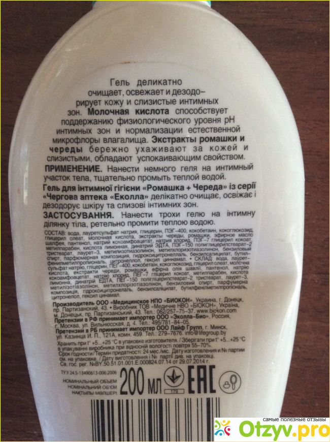(Дежурная аптека эколла) ведь это не просто средство что продается в химическом магазине , а это средство я покупала в аптеке (Бажаемо здоровья) в Украине , по крайней мере я не видела его кроме как в аптеке, это внушает доверие что товар действительно очень хороший и качественный, и боятся не чего , эффект уже после первого применения , кожа интимной зоны нежная и ощущение легкости и свежести, нету никакого раздражения, по крайней мере у меня не было а значит аллергии нет на данное средство, но конечно для каждого все индивидуально каждый человек реагирует по своему, но мне действительно помогает и очень благодарна производителю , что создал такой гель для интимной гигиены , и конечно же фармацевту что посоветовала взят именно такое средство.