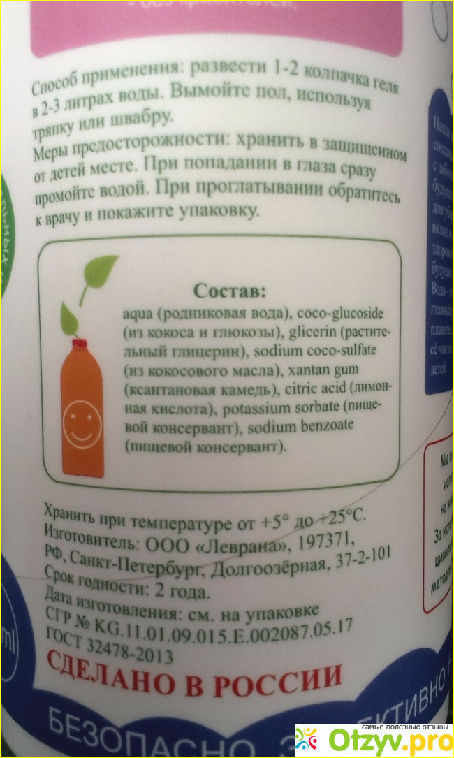 К гелю необходимо немного привыкнуть, так как в отличии от других средств он не даёт обильной пены и хочется добавить много средства. Этим гелем можно мыть пол не опасаясь за кожу своих рук. Прекрасный состав, практически полностью натуральный не нанесёт вреда не детям, не животным, не лицам, страдающими аллергическими реакциями.