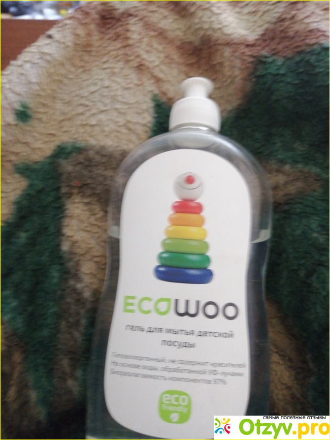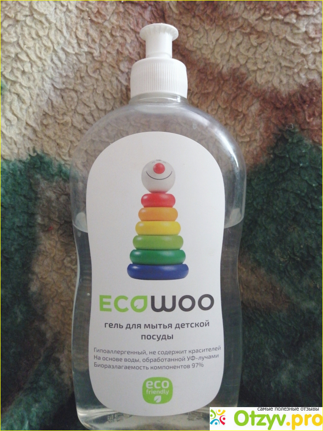 Гель для мытья детской посуды Ecowoo герой моего сегодняшнего отзыва. Бутылочка пластик с дозатором, оформление простецкое, детская пирамидка и белый фон.