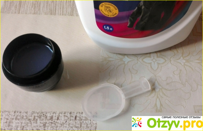 Во-первых, средство отстирывает, не оставляя разводов (честно говоря, всегда ставлю многократное полоскание), и при этом защищает от выцветания. Конечно, серьезные пятна не выводит - но с такой проблемой призваны бороться пятновыводители.