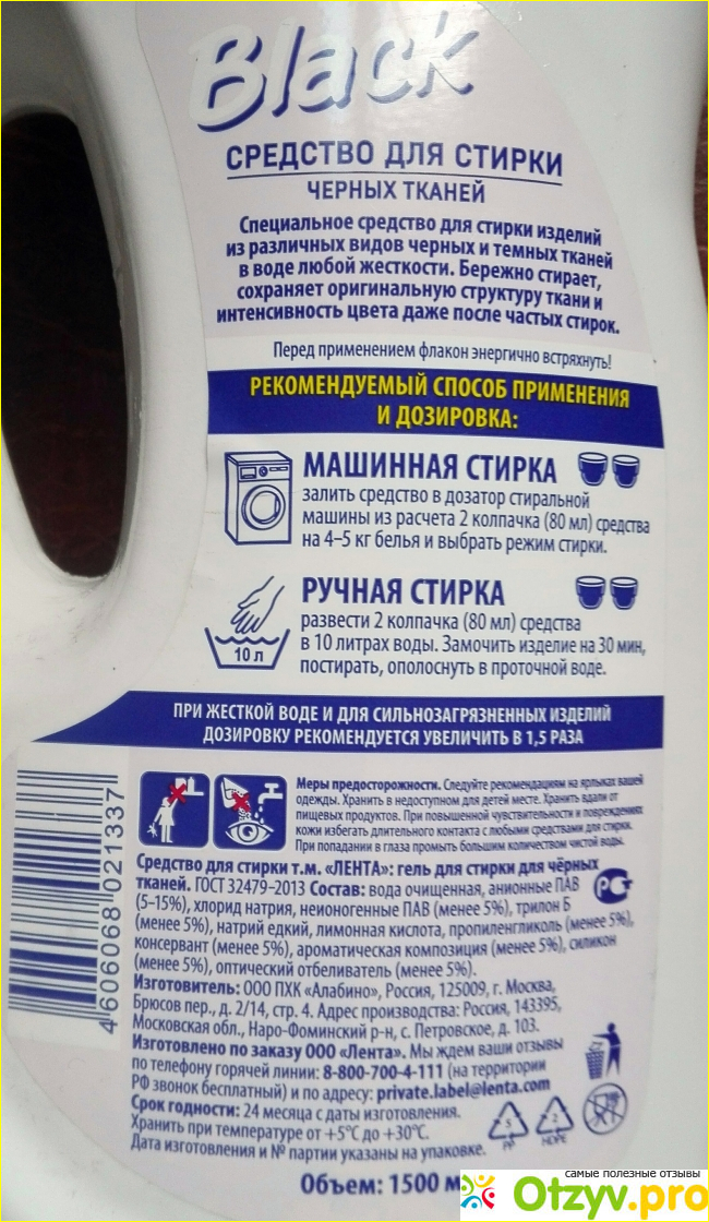 Во-вторых, у "Ленты" очень густой гель — он даже не течет, а как бы перетягивается через край. Меня это полностью устраивает, так как имею предубеждение против жидких моющих средств. Возможно, это и неправильно, но не использую такие. Гель для черного от "Ленты" самый густой из тех непорошковых средств, что я когда-либо пробовала. Кстати, сам он практически не имеет цвета, разве что, совсем немного в сероватый тон отдает. Но когда разводишь, вода перестает быть прозрачной.