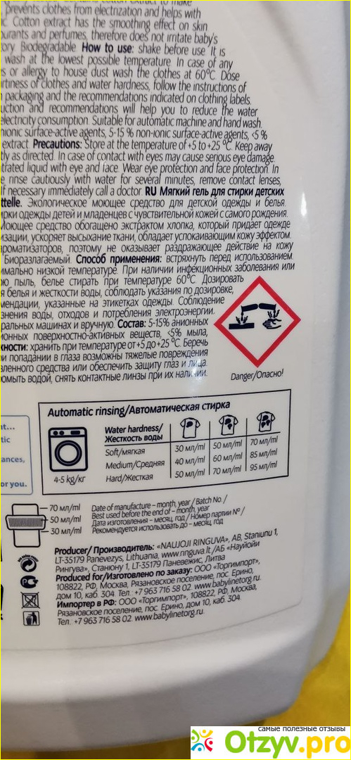 Обычно я стираю одежду ребёнка при 30-40 градусах на быстром режиме с 1 колпачком. На упаковке написано, что литровой бутыли этого геля хватит на 17 стирок. В принципе, выходит довольно выгодно. За две недели использования я израсходовала примерно 1/3 от полного объема.