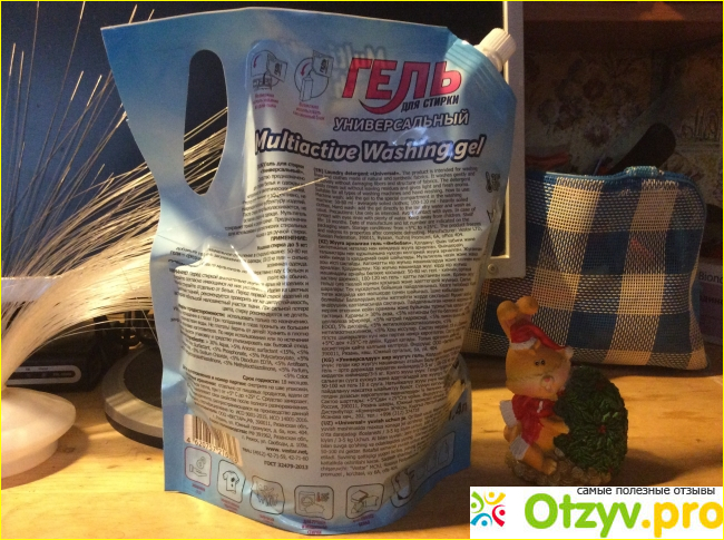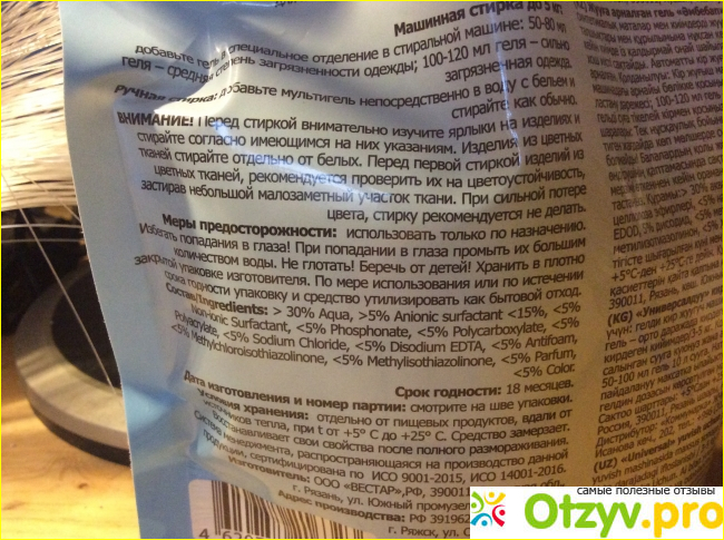Упаковка геля для стирки также заслуживает внимания. Он разлит в плотный пластиковый пакет с ручкой, что делает его удобным в использовании. Крышечка плотно закрывает гель, предотвращая его высыпание. На обратной стороне упаковки есть подробная информация о составе, производителе, правилах использования и сроках геля. Если кому-то неудобно пользоваться такой упаковкой, можно перелить гель в флакон из-под использованного порошка. Лично мне такая упаковка очень удобна, она помещается в любой шкаф или на любую полку.