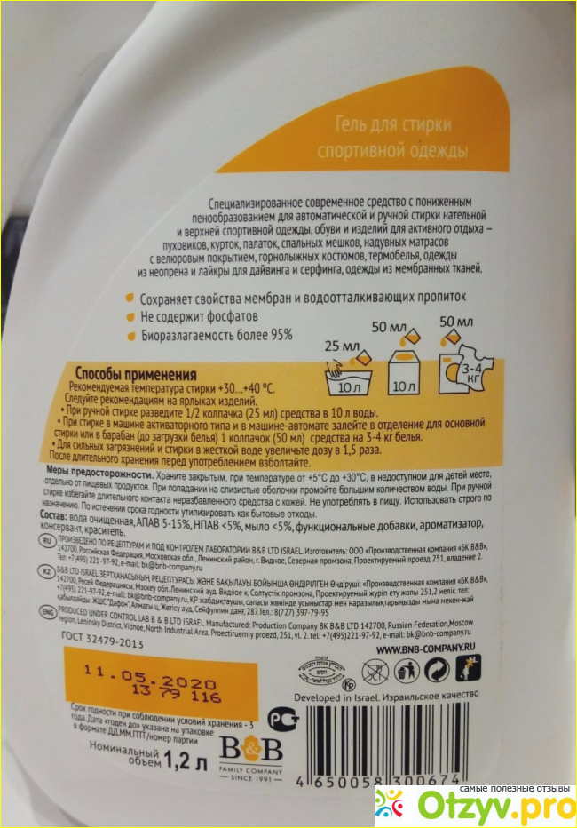 В процессе стирки гель пенится, но в меру. Это важно. Данное средство именно этим и отличается от других, пониженным пенообразованием. Результат стирки хороший. Но все таки я бы рекомендовала застирывать предварительно проблемные места, такие как рукава например. В общем и целом вещь после стирки достаточно чистая, пахнет свежестью и главное сохраняет свои свойства "мембрана".