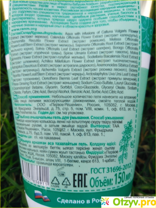 Гель довольно густой по консистенции, с очень приятным ароматом отвара различных трав.