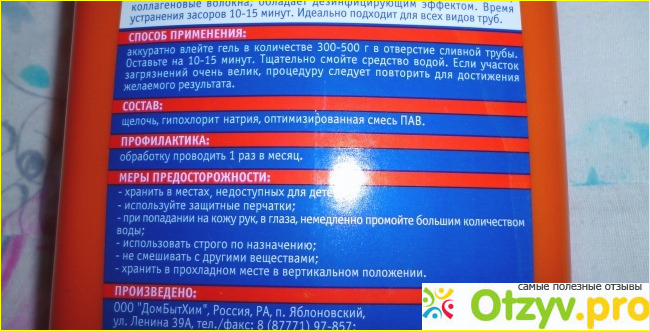 На оборотной стороне очень подробно написано как пользоваться данным средством, его состав, дозировки и прочее. Как я уже говорила, что средство рассчитано по действию на пятнадцать минут, а заливать нужно триста-пятьсот миллилитров, я заливала пятьсот, чтобы наверняка, а держала дольше, так как мне не внушил доверия тот факт, что средство может за пятнадцать минут избавить от засора.