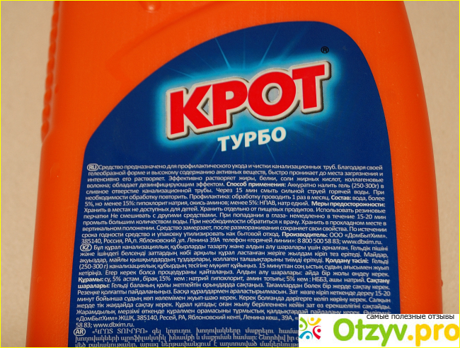 Среди запомнившихся средств для устранения засоров хочу отметить "Крот Турбо" от производителя "ДомБытХим". Бутылочка сразу выделяется среди других бытовых продуктов своим ярким цветом, как бы показывая, что на нее нужно обратить внимание (и детям в руки не давать). Пластик прочный, брать и работать с бутылкой удобно, она снабжена надежной крышкой с защитой от детей (и от протеканий).