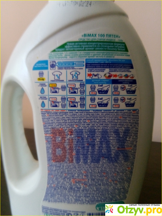 1,5 литра средства заменяет 3 кг порошка. Последнее время все чаще выбираю жидкие средства для стирки, т. к. они не оставляют следы порошка на одежде после высыхания, да и экономичней. На обратной стороне бутылке написаны дозировки использования.