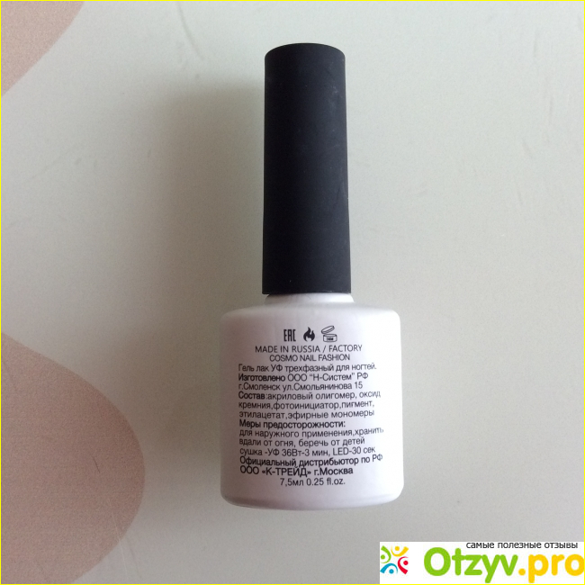 На упаковке есть ряд информации, которая может пригодиться потребителю. В число этой информации входит дата изготовления и дата годности, которые расположены на наклейке на дне бутылочки. Так же на ней есть артикул и объем бутылочки, а именно 7,5 миллилитров. Помимо этого на самой упаковке есть уточнение, что после первого открытия упаковки гель годен 36 месяцев, произведен продукт в России, а именно в Москве. Также немаловажно ознакомиться с мерами предосторожности, рекомендациями производителя по времени просушки слоев этого средства.