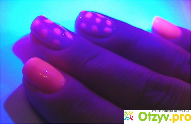 2. После этого вспомогательной кистью в произвольном порядке сделала розовые пятнышки, подсушила их в лампе. На это фото заметно, как розовый неон на фоне молочного NUDE подсвечивается изнутри под ультрафиолетовыми лучами.