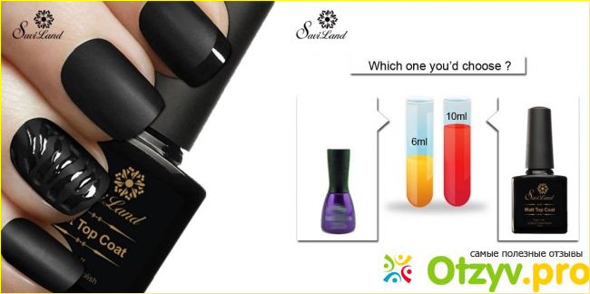 Матовый Top Saviland уникален своим черным цветом, сохнет в лампе очень быстро, но имеет неприятный запах в отличии от всех, чем я пользовалась. Объем десять миллилитров, цена: один доллар и восемьдесят семь центов.