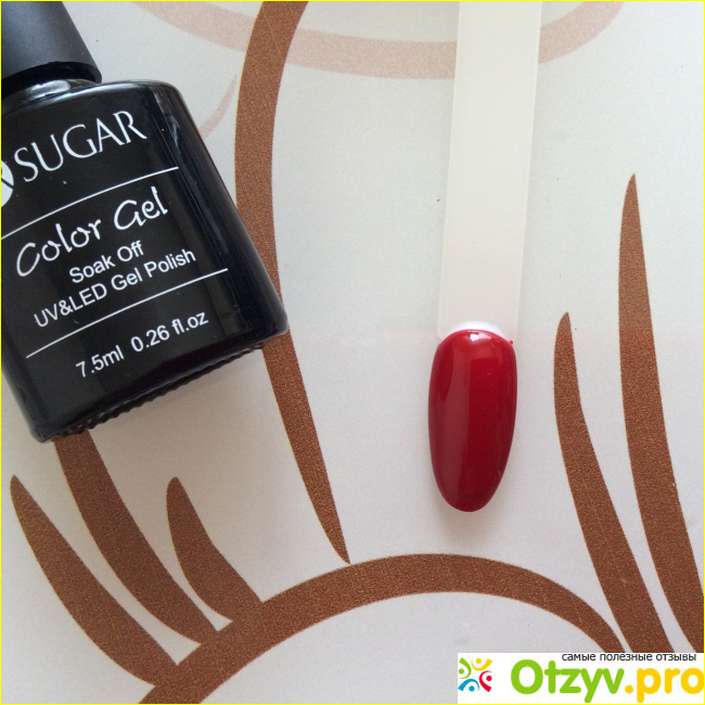 В данном случае у меня тёмно-красный цвет, очень красивый, насыщенный, без розового подтона. Распределяется очень хорошо, у него хорошая пигментированность. Хватает одного слоя, чтобы полностью перекрыть ногтевую пластину. Но второй слой необходим, так как он добавляет насыщенности цвету и убирает все погрешности после первого слоя. На ногтевой пластине носится от трёх недель и более без сколов, трещин, изменения цвета. Этот гель-лак отлично показал себя в работе с топами и базами других марок.