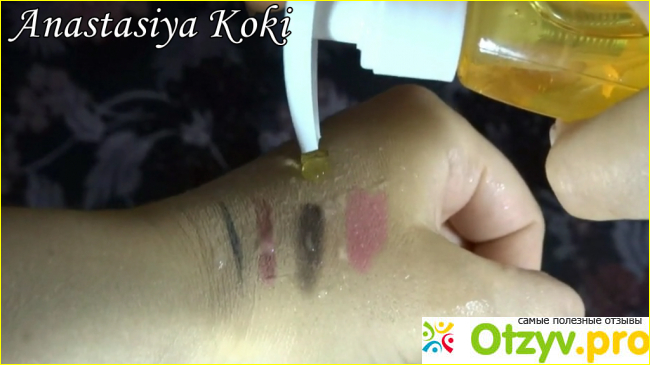 Сейчас покажу вам работу этого средства наглядно. Наношу на руку довольно плотную тональную основу, стойкий карандаш для глаз, стойкую губную помаду и обычную увлажняющую помаду, также довольно стойкие матовые тени для век.