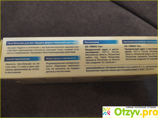 В составе помимо бадяги и каштана есть ещё экстракт пиявки, ментол, масла арники, лаванды, чайного дерева, лимона, и много что ещё. Это всё даёт крему сильный аромат, но в то же это очень хорошие компоненты. И всё же хочу отметить, что это не лечебное, а косметическое средство. Даже нормальной инструкции к нему нет. Только то, что на коробке написано. Бальзам обладает противоотечным и сосудоукрепляющим действием. Это действительно так, гематомы рассасываются, кожа успокаивается. Но всё же надеюсь, что больше это средство нам не понадобится.