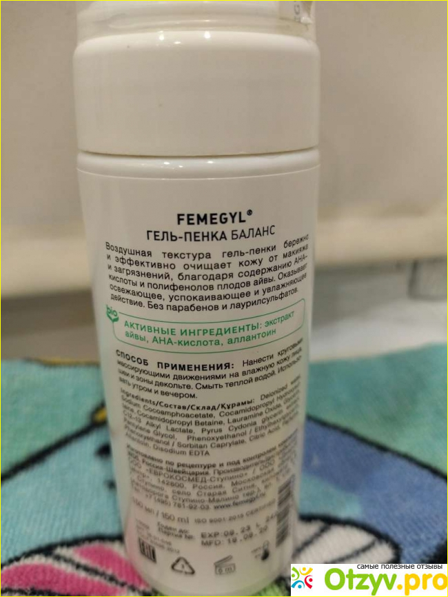 Этот гель-пенка не содержит сульфатов, парабенов или красителей. Очищает кожу от загрязнений качественно и бережно. Помимо мягких ПАВов в гель-пенку Баланс входят натуральные фруктовые кислоты и экстракты, за счет чего при регулярном использовании запускаются более активные процессы обновления и омоложения. Сразу после умывания гель-пенкой кожа - нежная, не пересушенная, без чувства стянутости или шелушений. После очищения я использую лосьон Femegyl Гидробаланс, который нормализует выработку кожного сала, тонизирует кожу и при этом дает хорошее увлажнение без чувства липкости. И заканчиваю я уход Восстанавливающим и питательными кремом для лица. Он - достаточно плотный и жирный. Я наношу его совсем чуть-чуть похлопывающими движениями, чтобы не переборщить и чтобы не было блеска, но в то же время чтобы насытить кожу необходимым. А если он все же появляется, то убираю его с помощью бумажной салфетки, промакиваю ей лицо.