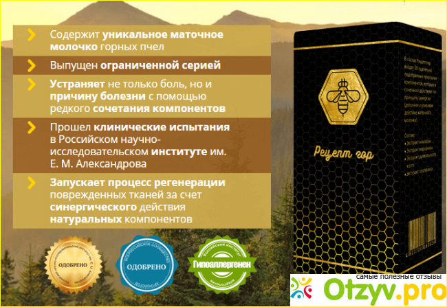 Производитель на сайте часто делает упор на натуральный состав геля Рецепт гор. Здесь действительно можно увидеть множество натуральных компонентов. В их число входит такой ингредиент, как маточное молочко. Это довольно дорогой продукт пчеловодства. Этот компонент обладает противовоспалительным действием. Компонент способствует снятию боли и воспаления на обработанных участках. Также это средство помогает восстановить поврежденные ткан. Но нужно понимать, что любой крем не способен проникать в глубоки слои кожи и ткани. А проблемы с суставами кроются как раз именно там. Крем же оказывает местное воздействие на проблему. Поэтому не стоит надеяться на то, что маточное молочко будет способствовать полному восстановлению суставов.