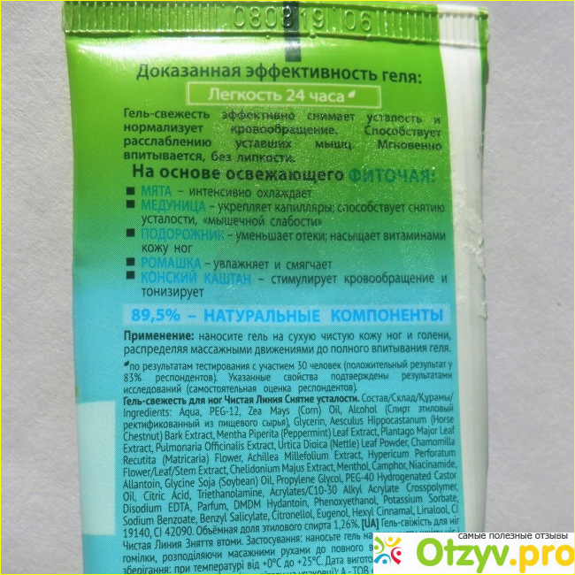 В чем же секрет эффективности данного геле? Вероятно, в том, что в его состав входят такие лекарственные растения, как мята, медуница, подорожник, ромашка, конский каштан. На упаковке геля указано, какое именно действие они оказывают.