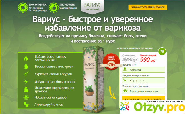 Гель Вариус изготовлен исключительно на натуральной основе, его применение значительно облегчит симптомы варикоза, в этом сомнений нет. Проверено на моей старшой сестре, которая давно страдает этой проблемой, что она только не пила и не мазала, а работа у неё постоянно на ногах, она повар. Вот после использования Вариуса, ей стало намного легче. Но всё равно, радикального метода ей избежать не удастся.