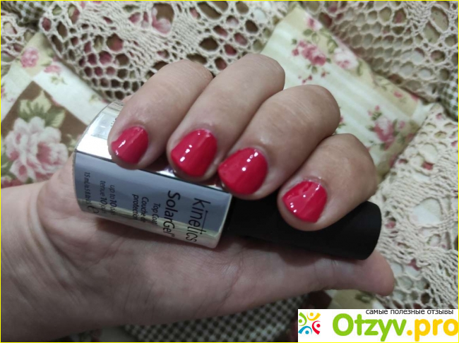 Текстура лака похожа на гель, потому как она легко наносится и быстро самовыравнивается. А вот то что гелевый лак не нужно сушить под лампой, это большой плюс. В самом конце я также использовала родной ТОП Кинетикс Солар, именно он придал ногтям зеркально блеска, который можно уловить даже без вспышки. ТОП сушка идеально самовыравнивается и не затекает под кутикулу, за это ему можно поставить отдельную отметку в 5 баллов.