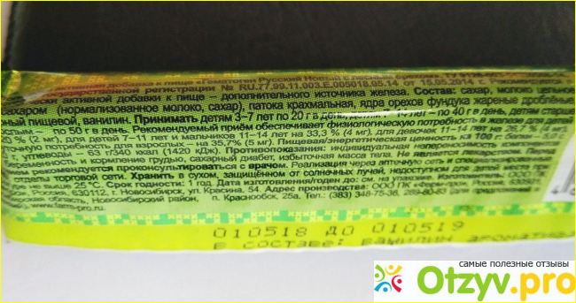 Хочу отметить медовый гематоген. Мне он понравился меньше всего из-за его плотности, твёрдости и вязкости. Он также поделен на части, но при этом дольку оторвать весьма проблематично. И за счет мёда в составе он тяжелее откусывается. Все указанные мною продукты выпускает одна торговая марка.