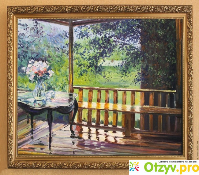 Многих интересует, чем же привлекает внимание эта картина, и чем она так завораживает зрителей. Ведь по существу, здесь изображается самый обычный пейзаж, который мы видим регулярную когда пройдет дождь. Изображена обычная веранда, точнее даже часть ее, на которой мы видим резные перила и небольшую скамеечку, которая расположена рядом.