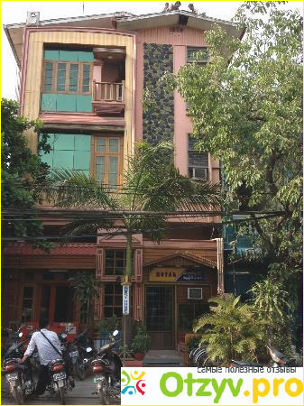Выглядит как трехэтажный дом сиреневого цвета с узким фасадом. Слева от входа ресепшен, где понимают только английский.