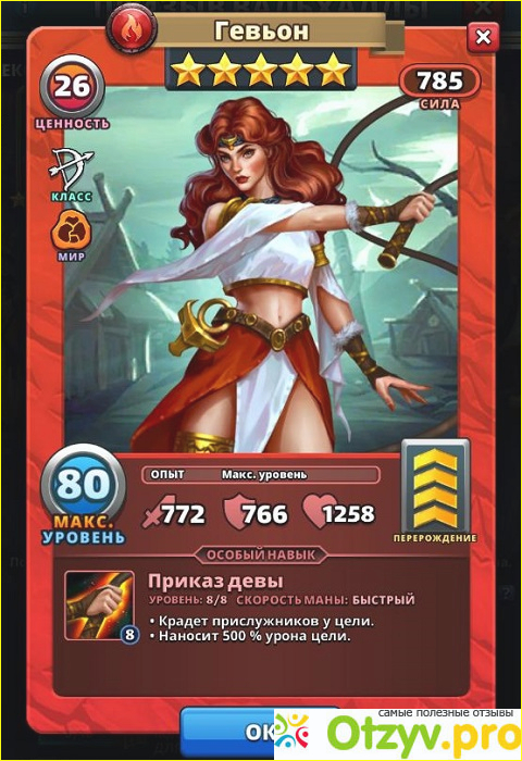 Она великолепна и по другим причинам. Её базовая характеристика обороны также очень высока 766. Что позволяет герою выживать в рейдах при одиночных снайперских попаданиях. Может даже потребоваться три снайперских попадания, чтобы убить Гевьон в обороне, если она расположена на флангах.