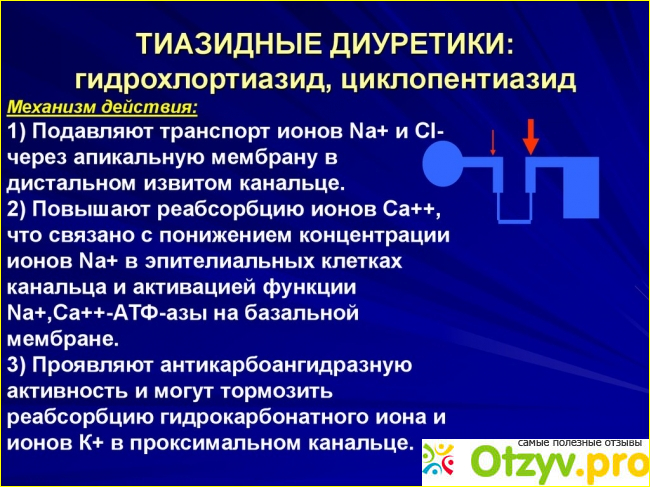 Это — мочегонное средство, тиазидный диуретик, то есть — вещество, способное выводить из организма лишнюю жидкость. За счет такого процесса, в организме человека происходит снятие отеков, снижение артериального давления и даже оказывается помощь при несахарном диабете — происходит уменьшение полиурии.