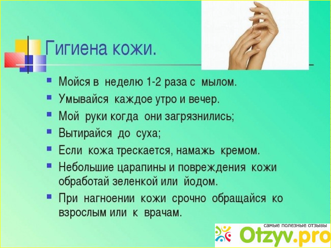 Гигиена кожи - это очень важная часть ухода за собой любого человека. Сюда входит в первую очередь мытье. Через грязную кожу в организм попадают инфекции. Особенное значение следует уделить мытью подмышечных впадин и половых органов, так как именно в этих зонах более высокая влажность, потливость и образуется огромное количество бактерий. как минимум раз в неделю нужно принимать ванну на протяжении 15 минут с с мытьем тела с мылом. Ежедневно рекомендуется душ, можно без моющих средств.