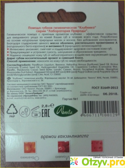 В составе есть как натуральные компоненты, так и химия. Но в целом помадой очень довольна, она ничем не хуже вариантов за 60 - 100 рублей, вроде Нивея или других. Хватает надолго, можно носить с собой зимой и пользоваться по мере необходимости. Так что советую это продукт.