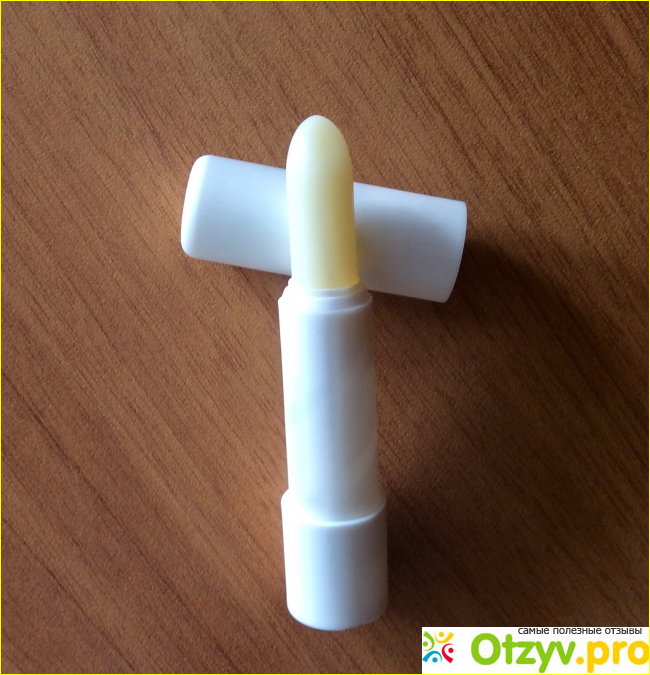 Гигиеническая помада без красителей, о чем говорит её нежный молочный цвет, а так же стик помады тонкий и аккуратный, имеет скошенный и удобный край верха для точного и удобного нанесения помады на губы.